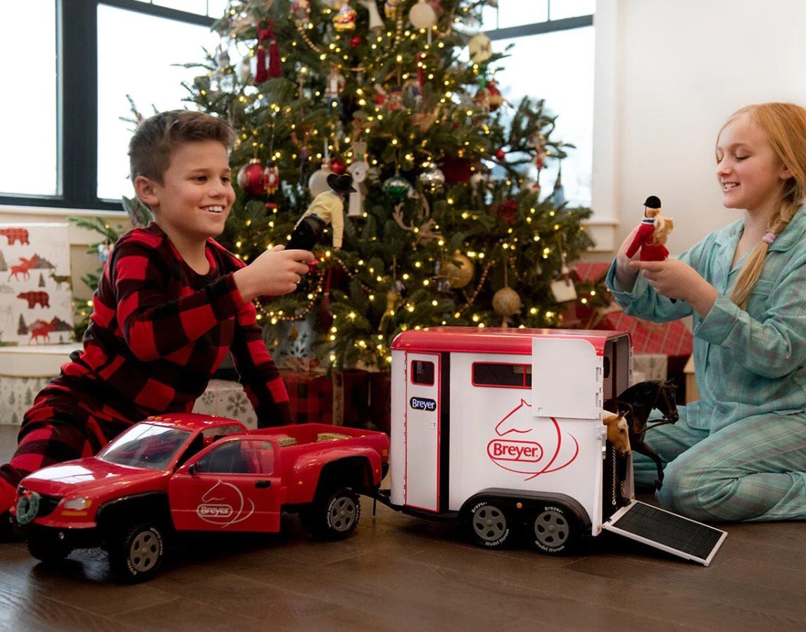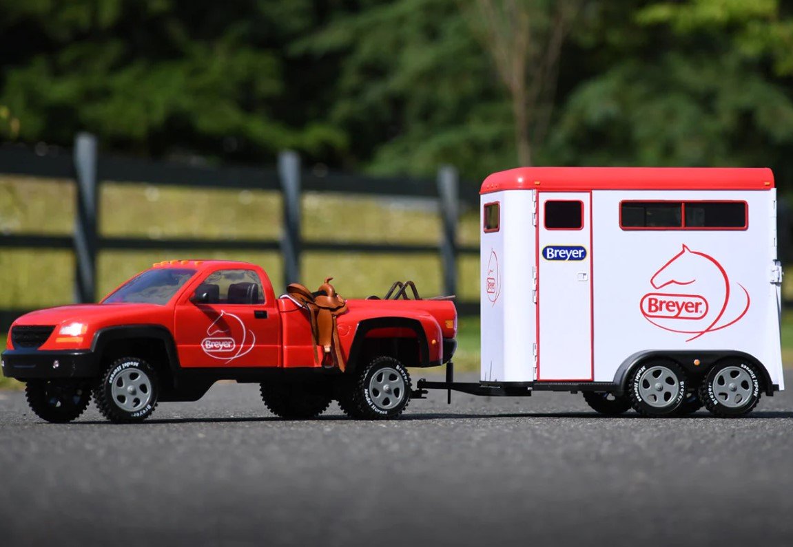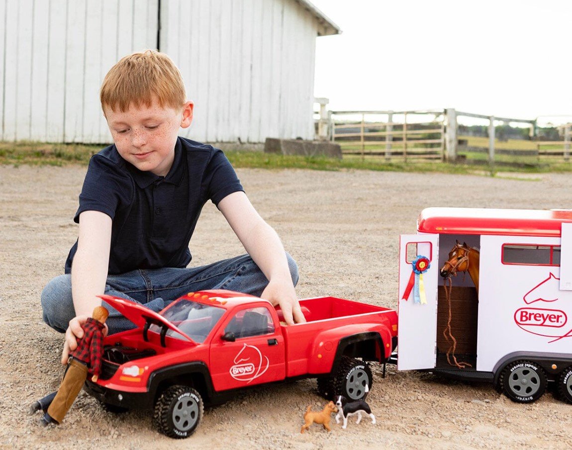 Breyer's "Dually" (for dual-wheeled) Truck hitches up to the matching Horse Trailer in a snap! Beautifully crafted, this super truck has room inside for two of our 8" figures. It includes rolling wheels, working rack-and-pinion steering, doors that open, two side-view mirrors, a working hood, tailgate, and hitch, as well as a sheet of decorative stickers!