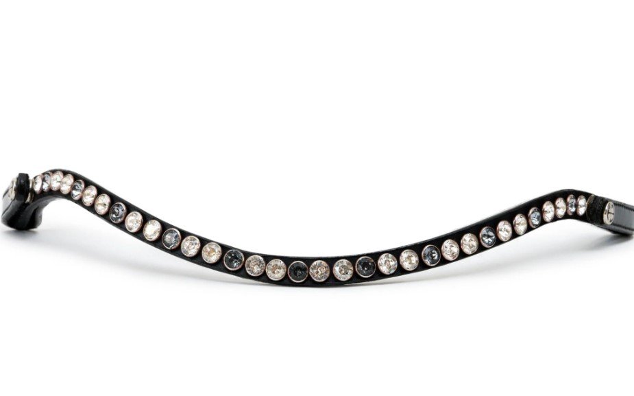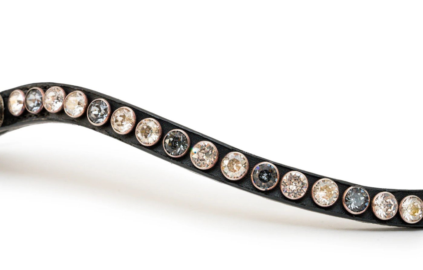 This browband is classic, sleek, and the perfect design to add to any bridle. Featuring alternating clear, silver night and silver shade crystal rivets, silver Halter Ego logo snaps and velcro within the browband loops for reinforcement -- you cannot go wrong with this browband!