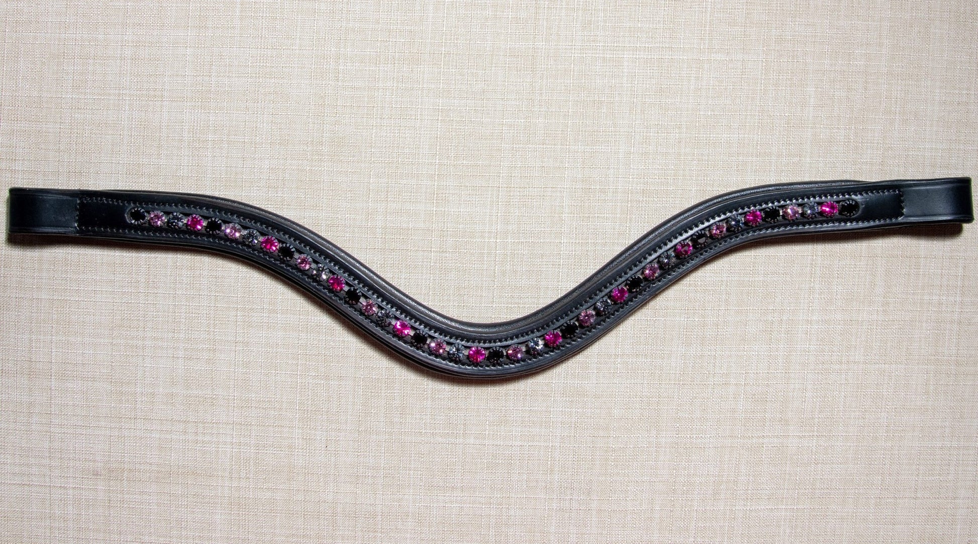 KL Select Blackberry Curved Browband in softly padded black leather will be a gorgeous addition to your dressage horse's bridle. The U-shaped browband features a row of Dark Pink, Light Pink, Black and Grey crystals for instant style and wow!