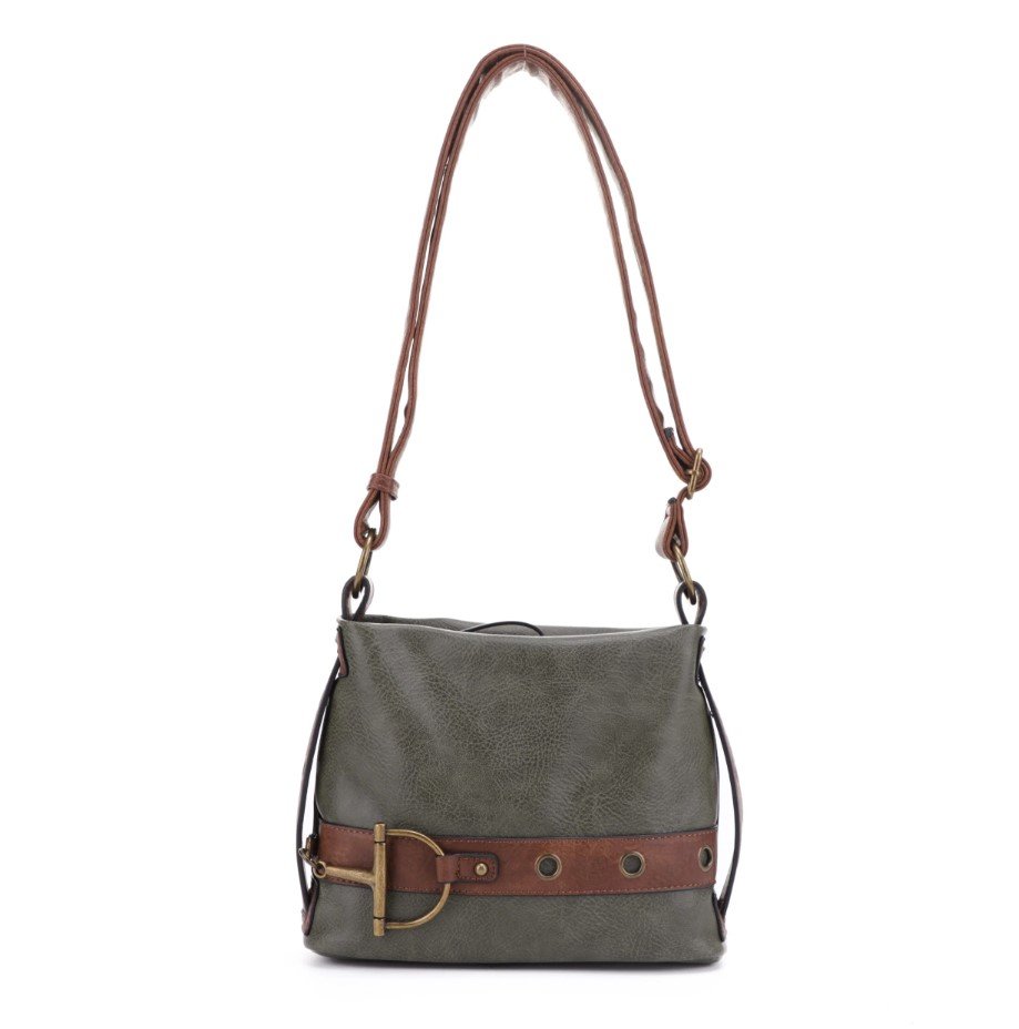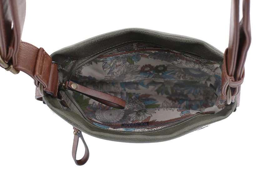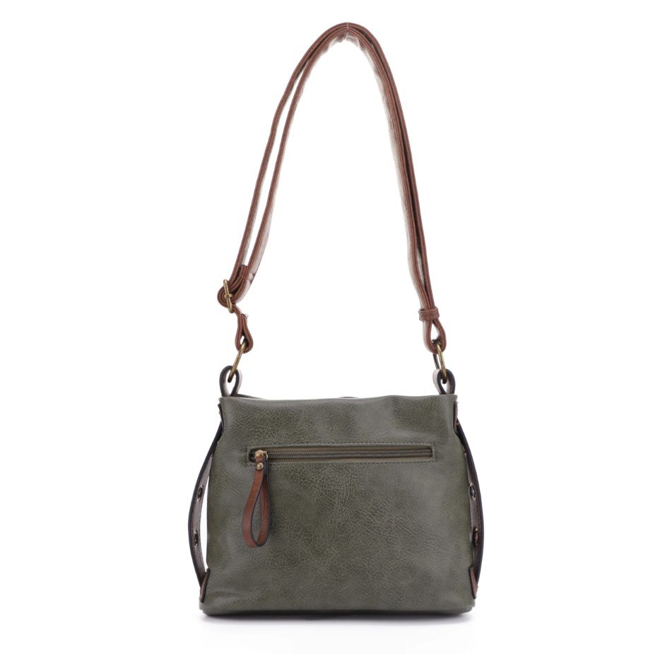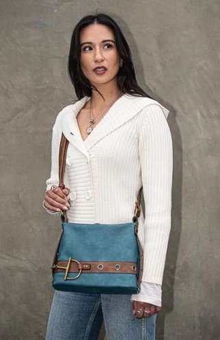 The Anna has a belt and buckle on the front, a wide adjustable strap and a mid-size that will easily fit all of your gear. Makeup, phone and a wallet easily fit inside. The top has a wide zipper plus a secure zipper pocket on the back. The dimensions are 10" wide, 8" tall and 6" in depth with a comfortable 1" cross body strap. The antique brass plating, rich material and color give the Anna a feel of quality and value. The Anna is available in Olive, Black, Teal, Coffee and Grey.
